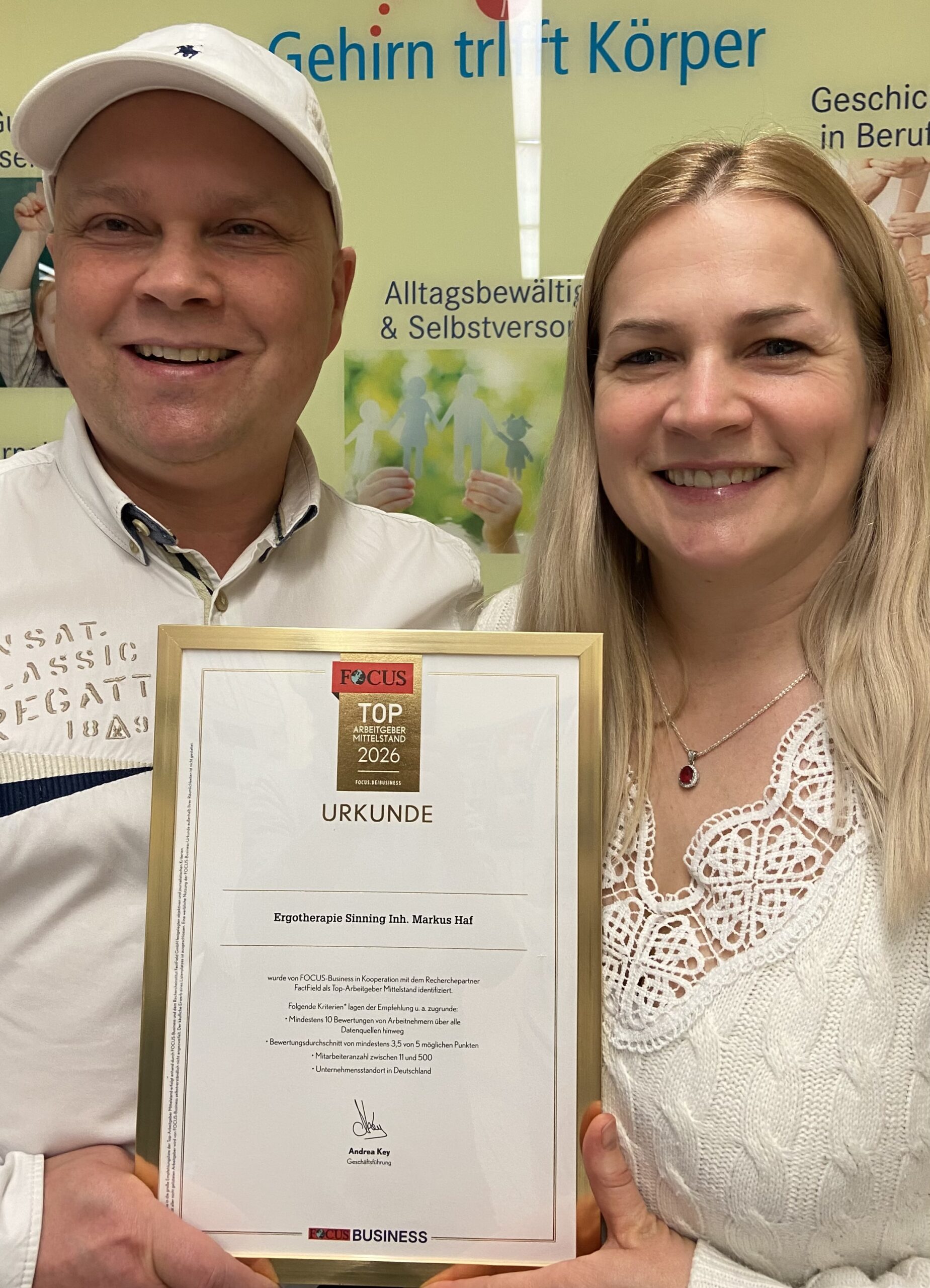 Die Praxis Sinning Ergotherapie & Handtherapie aus Nordhessen gehört deutschlandweit nun zu den besten Arbeitgebern im Mittelstand 2026. Mit großer Freude nahmen Praxisinhaber Markus Haf und Praxismanagerin Melanie Haf die Focus-Urkunde „Top Arbeitgeber Mittelstand 2026“ entgegen.